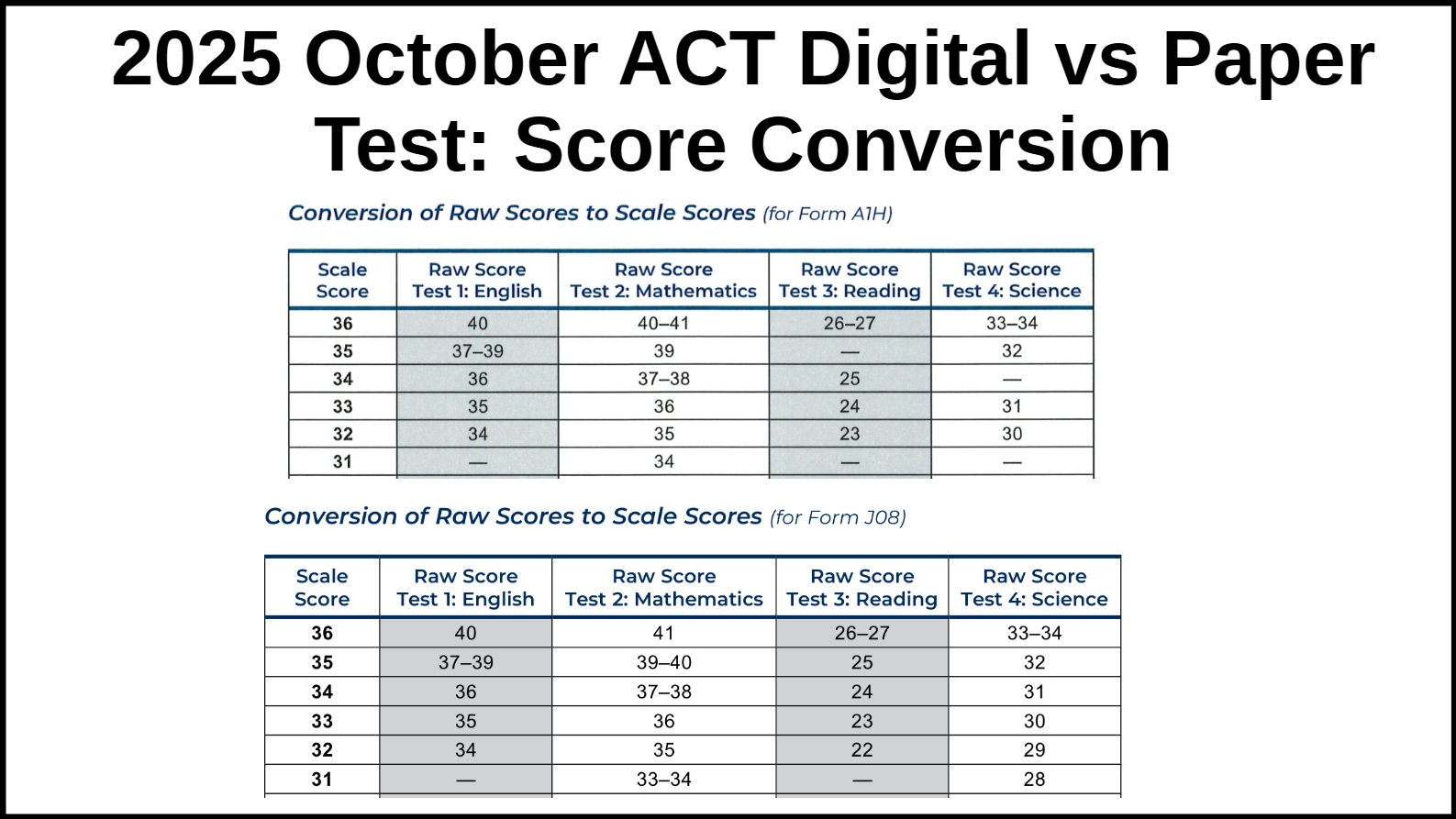 The attached image below shows the slight differences in the scale conversion between the 2025 October ACT test administered in a paper format(Form Code J08) and in a digital format(Form Code A1H). There are slight differences in the scale conversion, for example in the mathematics section a raw score of 40 or 41 translates to a scaled score of 36 in the digital ACT test, whereas a raw score of 41 is needed on the paper test to score a scaled score of 36.